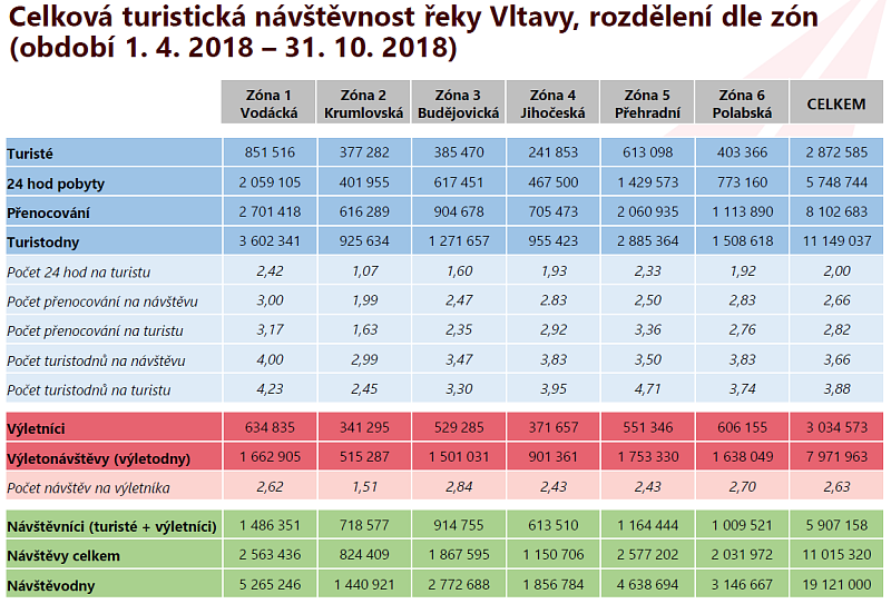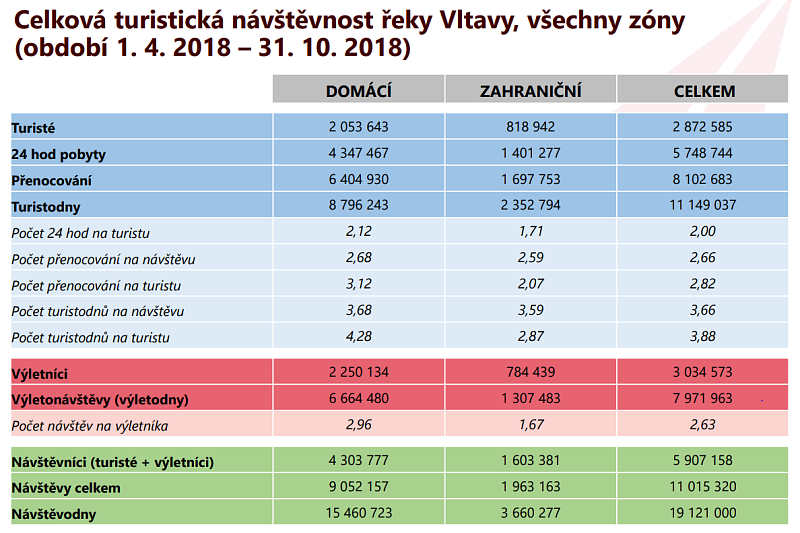 Celkem bylo ve všech zónách uskutečněno přes 11 miliónů návštěv s drtivou převahou domácích, více než 9 miliónů. V návštěvodnech to pak představuje celkem 19,1 miliónu dnů, z toho téměř 15,5 miliónu dnů strávených u Vltavy jde na konto tuzemských návštěvníků.