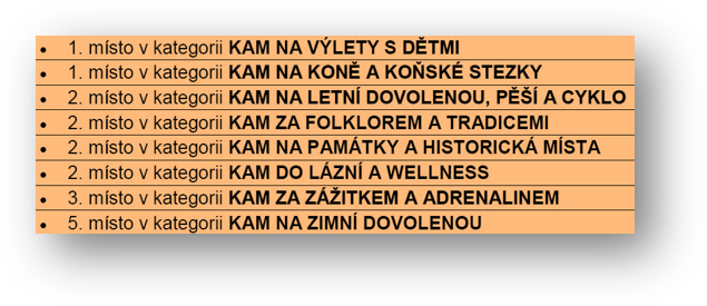 Názvy návštěvníky hodnocených kategorií mluví jasně. Jihočeský kraj, disponující unikátní přírodou a památkami, umí zabavit každého. Lenochy i aktivní sportovce. Milovníky historie i adrenalinu. Děti, seniory i celé rodiny. A samozřejmě i vozíčkáře. Těm všem umí nabídnout atraktivní celoroční program, kvalitní služby i dobré jídlo a pití.