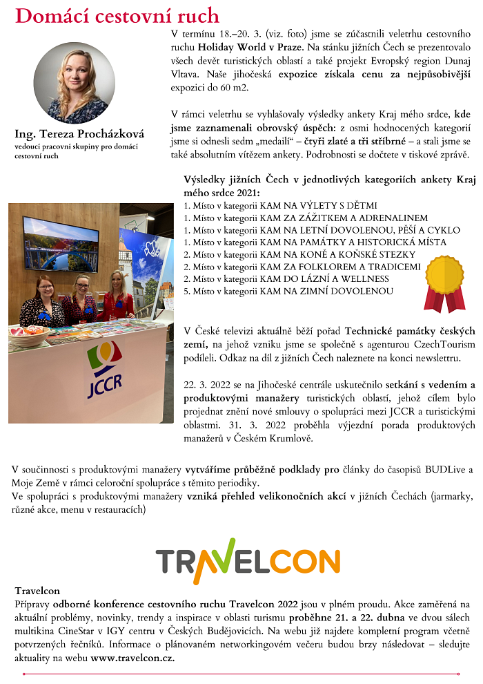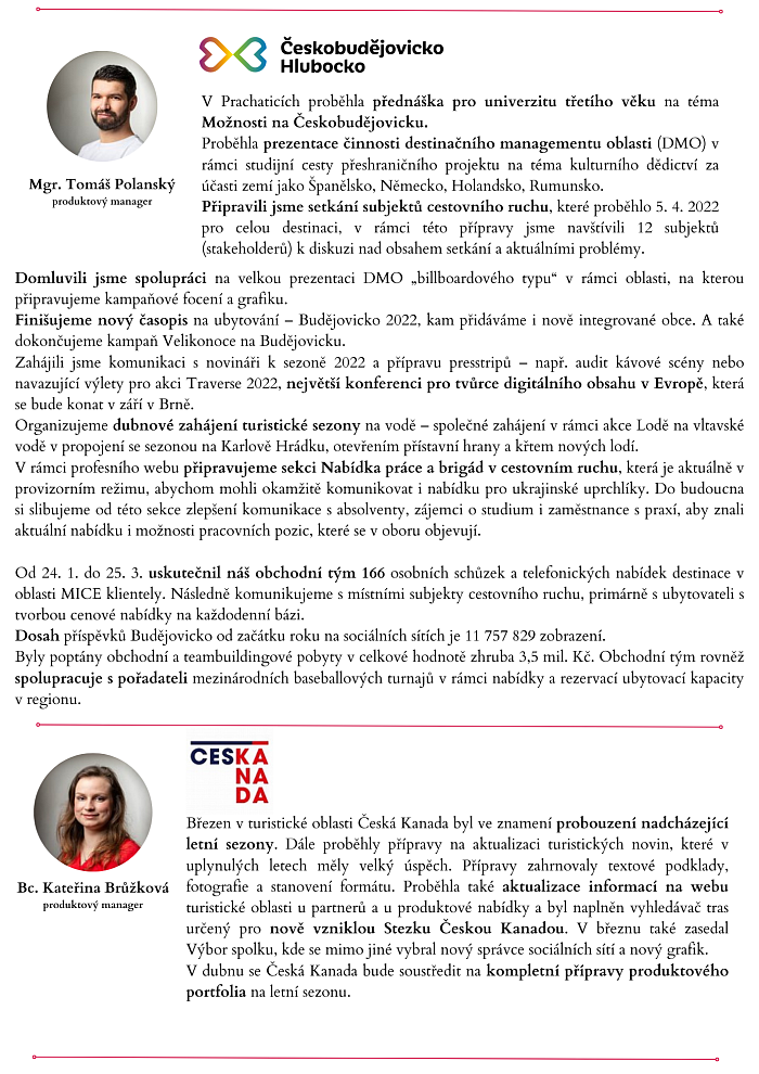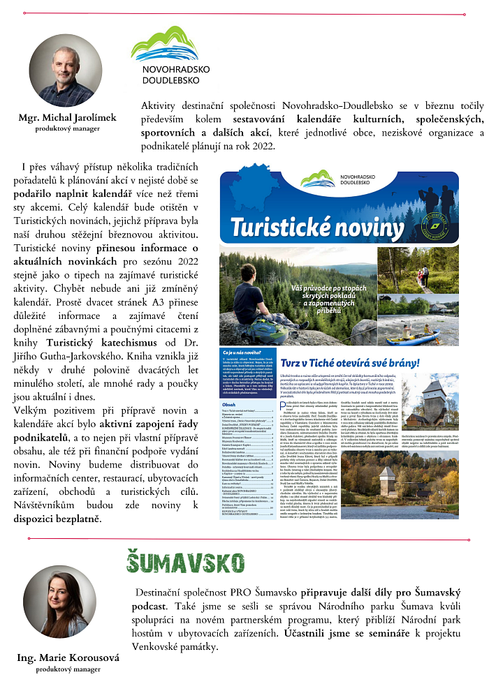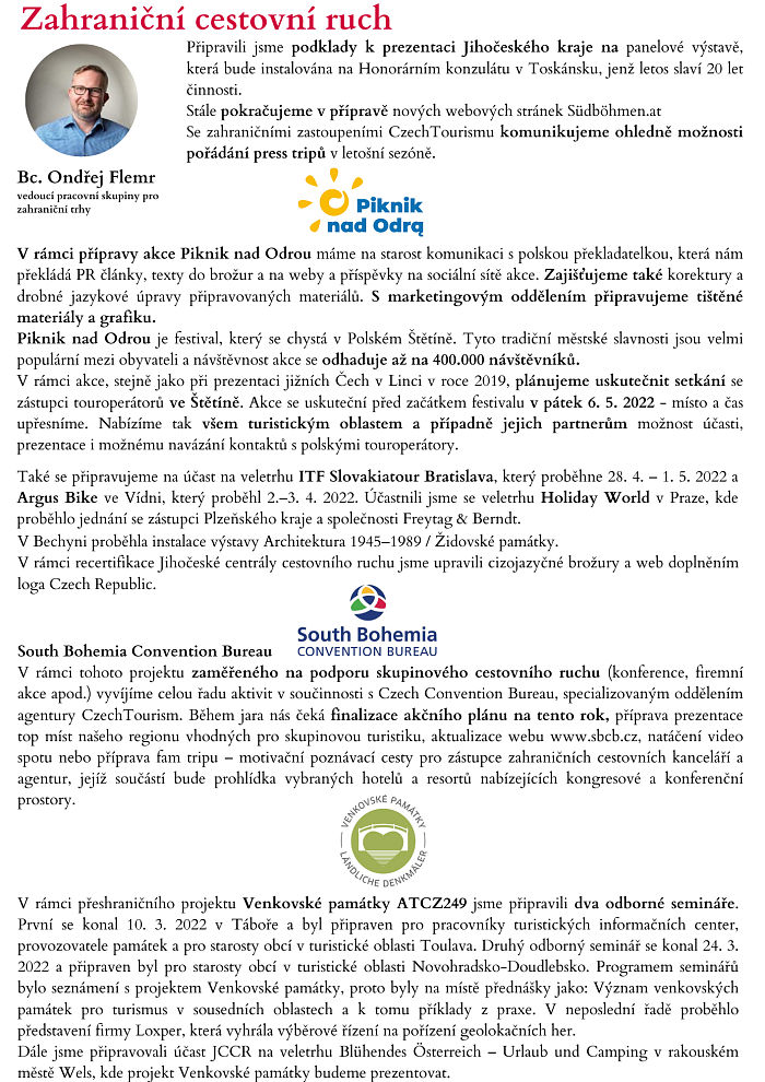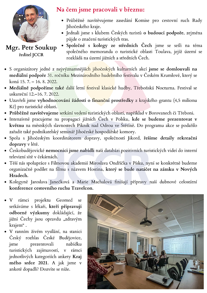 19.4. 2022 Shrnutí činnosti JCCR a turistických oblastí v jižních Čechách za měsíc březen. Newsletter ke stažení v PDF. Soubory ke stažení leták | pdf | 8.6 MB