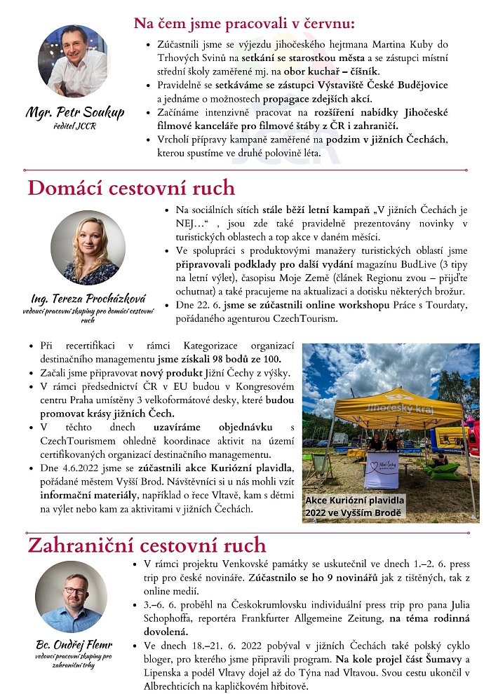 7.7. 2022 Shrnutí činnosti JCCR a turistických oblastí v jižních Čechách za měsíc červen. Newsletter ke stažení v PDF. Soubory ke stažení leták | pdf | 8.6 MB