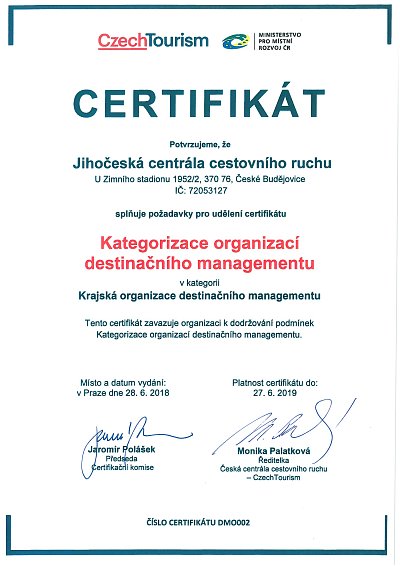 Agentura CzechTourism udělila Jihočeské centrále cestovního ruchu celostátní certifikaci Kategorizace organizací destinačního managementu v kategorii Krajská organizace destinačního managementu.
